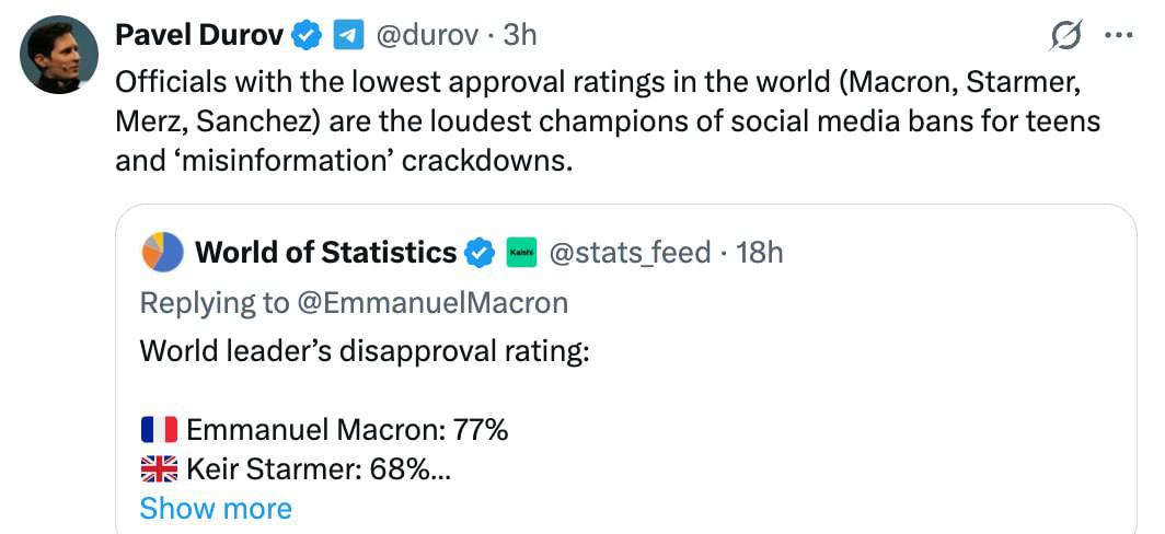 "Чиновники з найнижчими рейтингами схвалення у світі (Макрон, Стармер, Мерц, Санчес) найголосніше виступають за заборони соцмереж для підлітків і за боротьбу з "дезінформацією", - заявив Дуров.