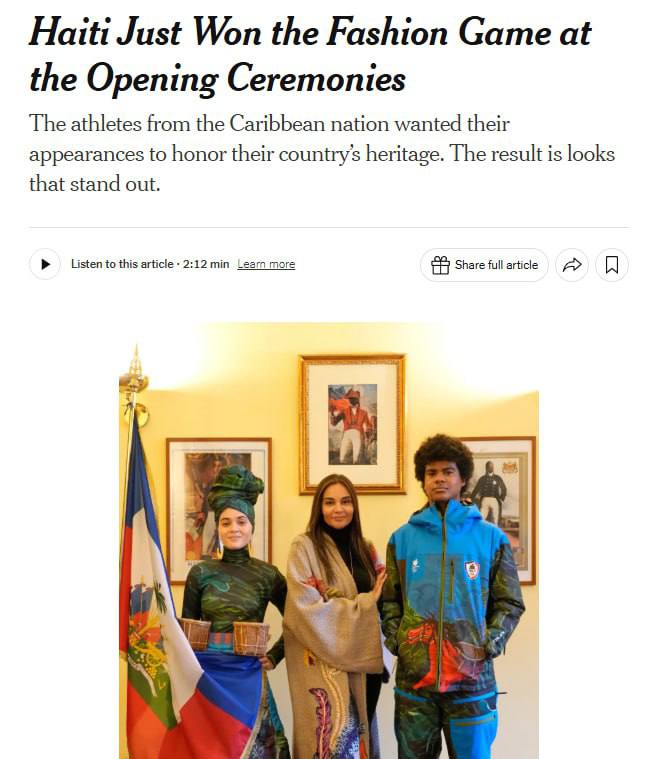 ЗМІ різних країн обговорюють дизайн італійсько-гаїтянського модельєра Стелли Джин, яка прикрасила зимові костюми олімпійців із Гаїті малюнками ручної роботи.