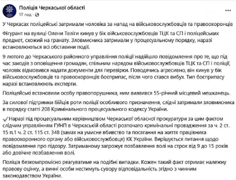 У Черкасах скоєно напад на співробітників територіального центру комплектування та соціальної підтримки та поліцейських: чоловік відмовився показувати їм документи про військовий облік, а потім кинув у них гранату.