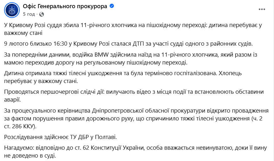 Про це повідомила прес-служба Офісу генерального прокурора на своїй сторінці у Facebook.