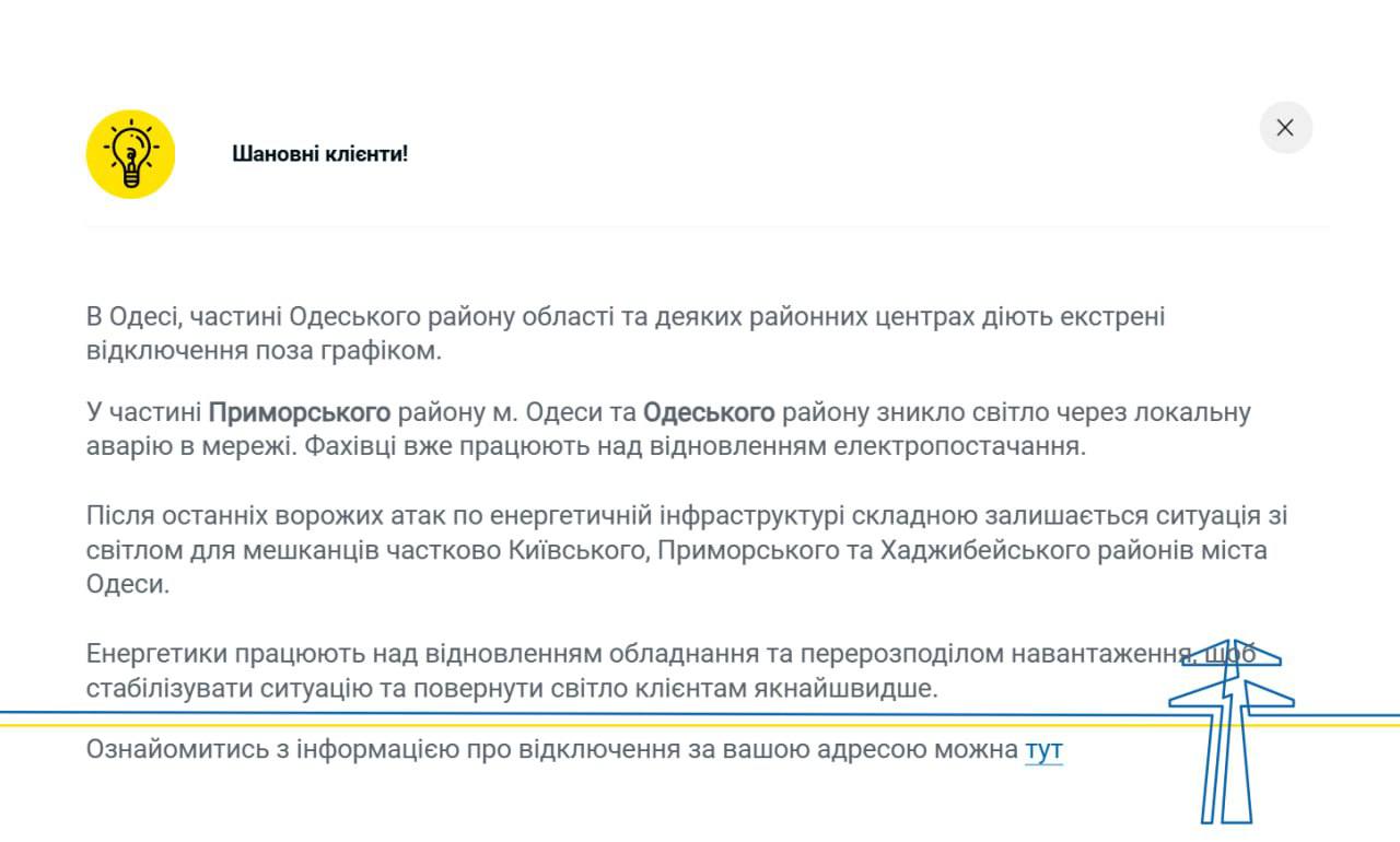 Йдеться про Приморський та Одеський райони, чия енергетика постраждала від ударів. Зараз енергетики намагаються перерозподілити напругу, щоб вирішити проблему.