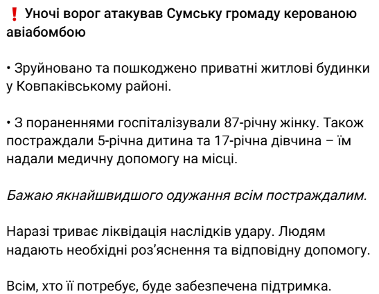 Сьогодні близько 4 години ранку російські війська завдали удару авіаційною бомбою, що коригується, по одному з приватних секторів міста Суми.
