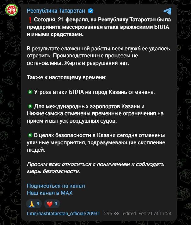 Пізніше влада Татарстану заявила, що на Республіку було здійснено масовану атаку з використанням БпЛА та інших засобів, але її було відбито.