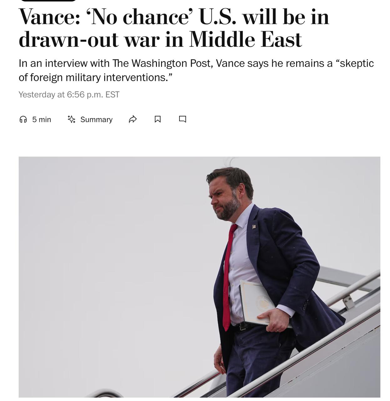 "Ідея про те, що ми вестимемо близькосхідну війну протягом багатьох років без кінця - немає ризику, що це станеться", - сказав Венс у коментарі The Washington Post.