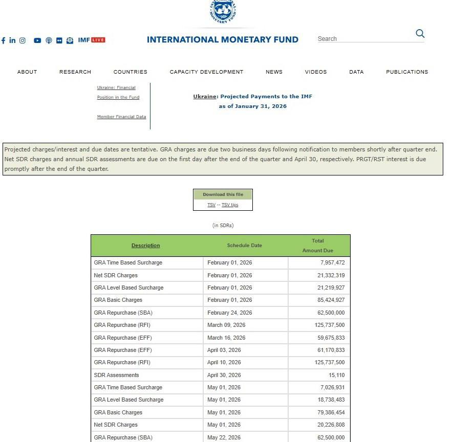 При цьому за графіком виплат за раніше наданими фондом кредитами 2026 року Україна зобов'язана віддати МВФ 1,88 мільярда SDR або 2,7 мільярда доларів. Тобто, протягом цього року доведеться віддати зазначені 71,1% отриманої суми.