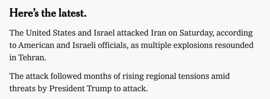 "Десятки американських ударів завдаються штурмовиками, що базуються по всьому Близькому Сходу, а також з одного або кількох авіаносців, повідомив американський чиновник. Американські офіційні особи заявляють, що ця атака буде набагато масштабнішою, ніж американські удари по іранських ядерних об'єктах у червні минулого року", - пише газета.