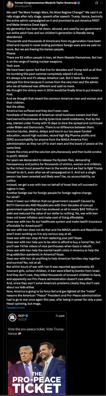 "Ми говорили: "Немає більше воєн за кордоном, немає більше зміни режимів! "Ми повторювали це на мітингах один за одним, у кожній промові. Трамп, Венс, по суті, вся адміністрація будували свою передвиборчу кампанію на цьому і обіцяли поставити Америку на перше місце і знову зробити Америку великою", - нагадала колишня конгресвумен.