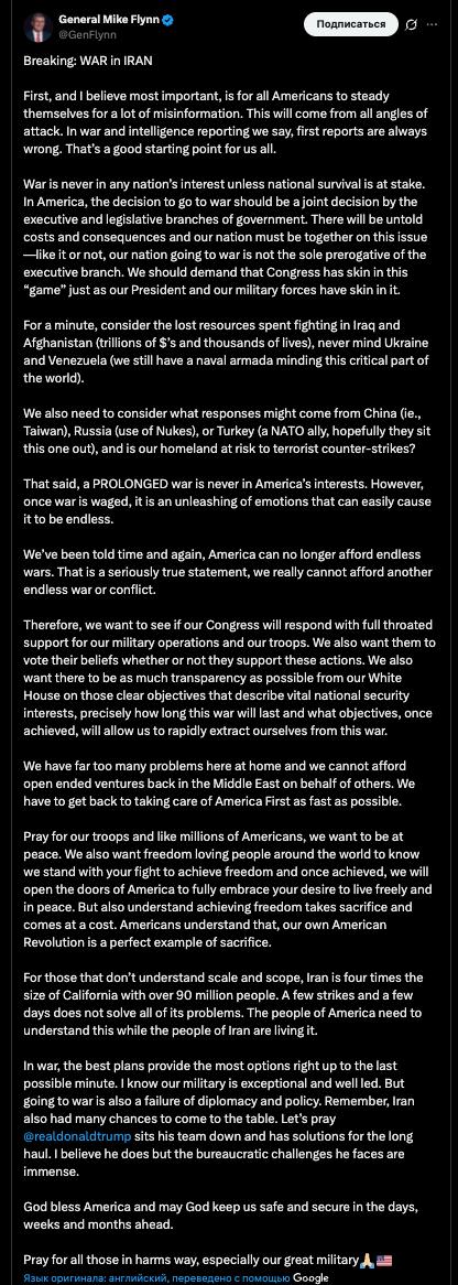 "В Америці рішення про початок війни має бути спільним рішенням виконавчої та законодавчої гілок влади. Будуть незмірні витрати та наслідки, і наша країна має бути єдиною у цьому питанні - подобається нам це чи ні, але війна нашої країни не є винятковою прерогативою виконавчої влади", - написав Флінн у соцмережі X.