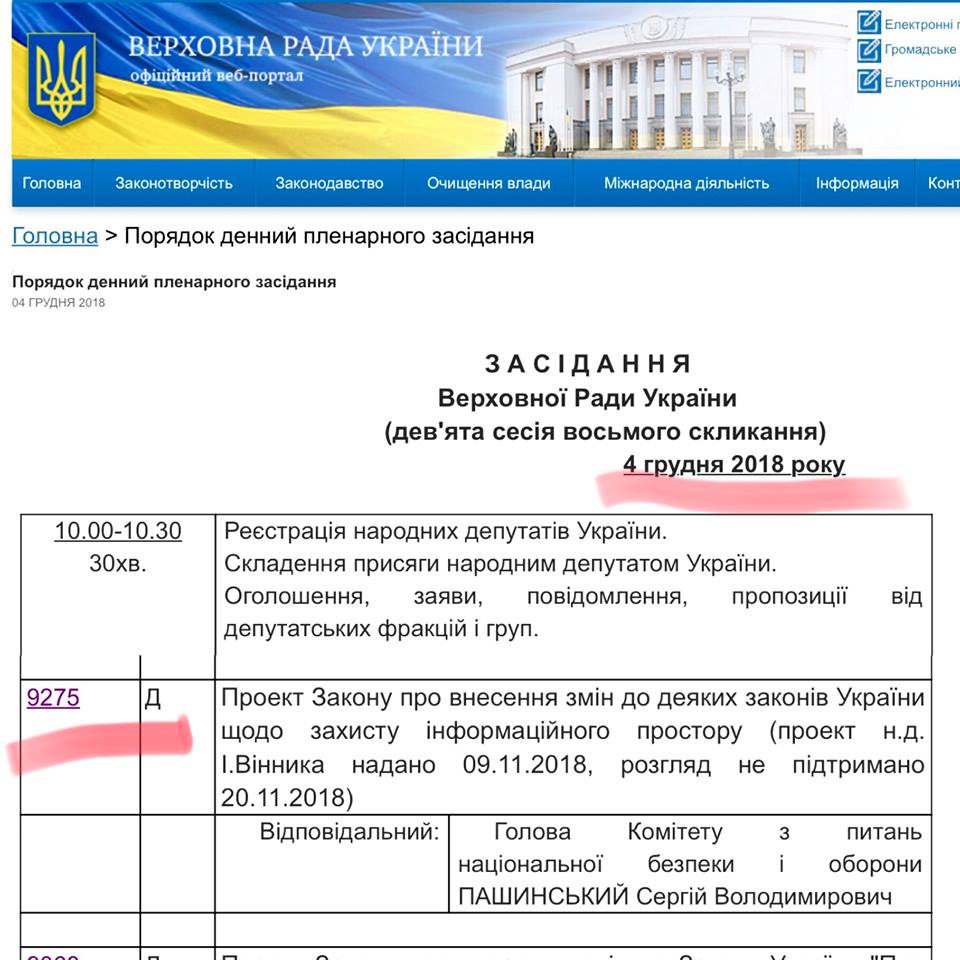 Сегодня, 4 декабря, в Киеве проходит очередное пленарное заседание Верховной Рады. Это заседание примечательно тем, что будут приняты попытки вновь рассмотреть законопроект №9275, который "освящает" применение Закона "О санкциях" в отношении украинских телеканалов. Об этом заявил глава НСЖУ Сергей Томиленко в Facebook.