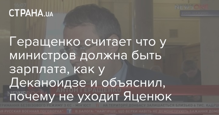 Депутат Антон Геращенко считает, что зарплаты министров должны достигать, хотя бы уровня зарплаты главы Нацполиции Хатии Деканоидзе, Донбасс вернется в Украину только на условиях выгодных Украине, а Яценюк уйдет, когда коалиционным соглашением будет утверждена новая кандидатура на пост Премьер-министра. Об этом он заявил журналистам после заседания Верховной Рады 15 марта.