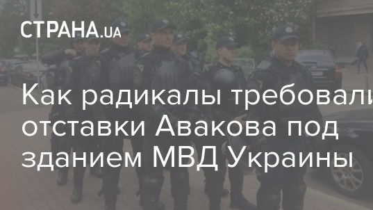 Радикалы из Добровольческого руха ОУН и ряда других националистических организаций проводят акцию протеста под зданием Министерства внутренних дел с требованием отставки главы МВД Арсена Авакова в связи с штурмом офиса ОУН в центре Киева на День Победы 9 мая.